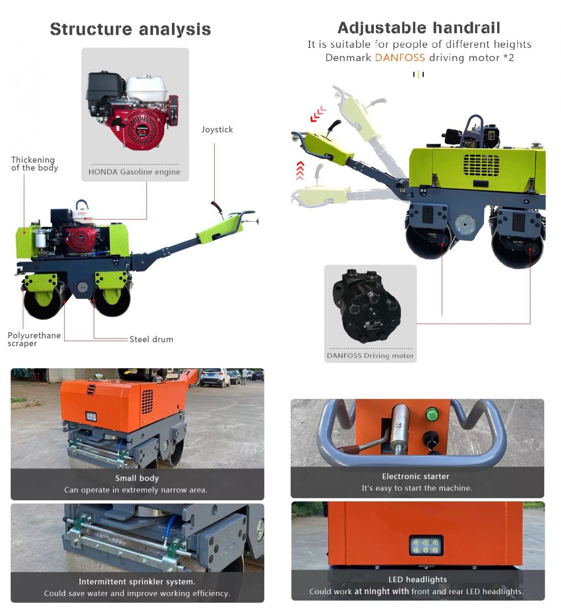 Катки имеют гидравлический привод SAUER, бесступенчатую регулировку скорости (вперед / назад), электрический запуск с контролем вибрации и электромагнитной муфтой, что упрощает эксплуатацию. Окрашен коррозионностойкой эмалью.